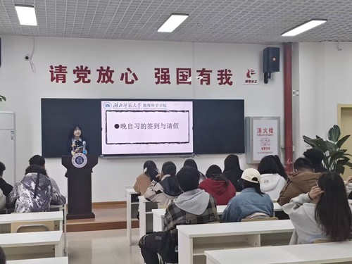 活動伊始,學風建設部部長胡志強就請假及請假條上交的流程規範進行講解,着重強調了請假條申請要規範,上交要及時。随後,校園安全部部長王維娜指出了目前晚點名存在的問題,并對晚點名流程和記錄表登記上交的規範性進行了重申。